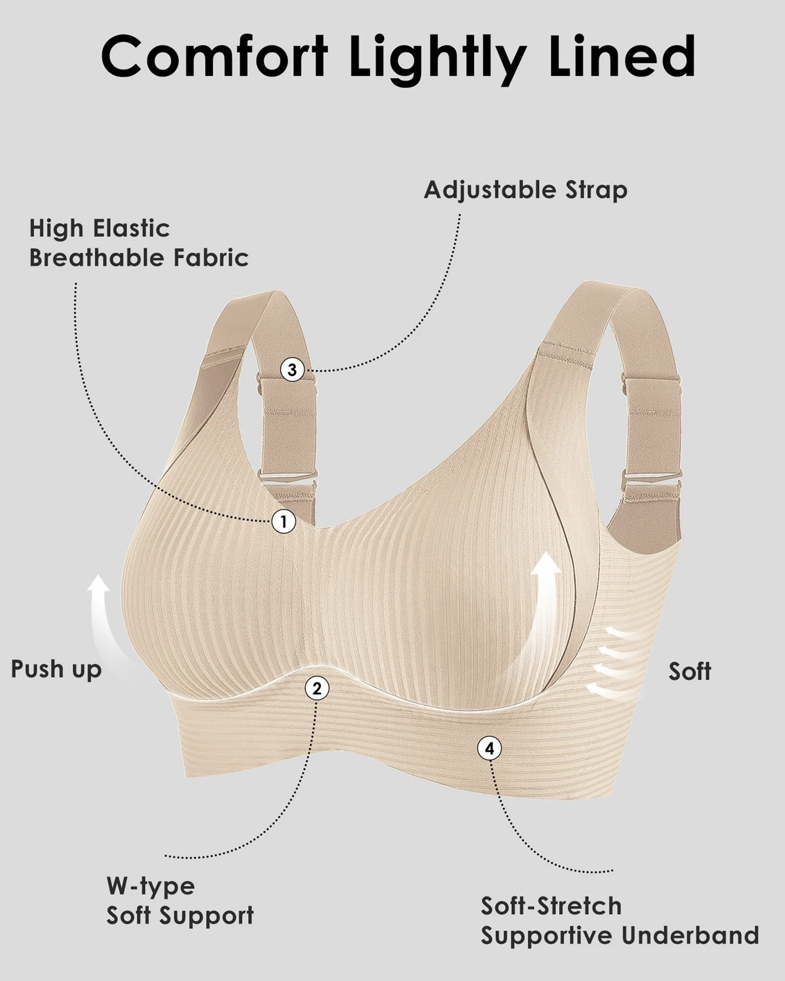 Look 10 pounds lighter instantly. The vertical-striped shell fabric slims your silhouette while providing breathable, full-cup coverage. W-shaped soft underband gently lifts and shapes for a rounded, perky look—without squeezing or restricting.