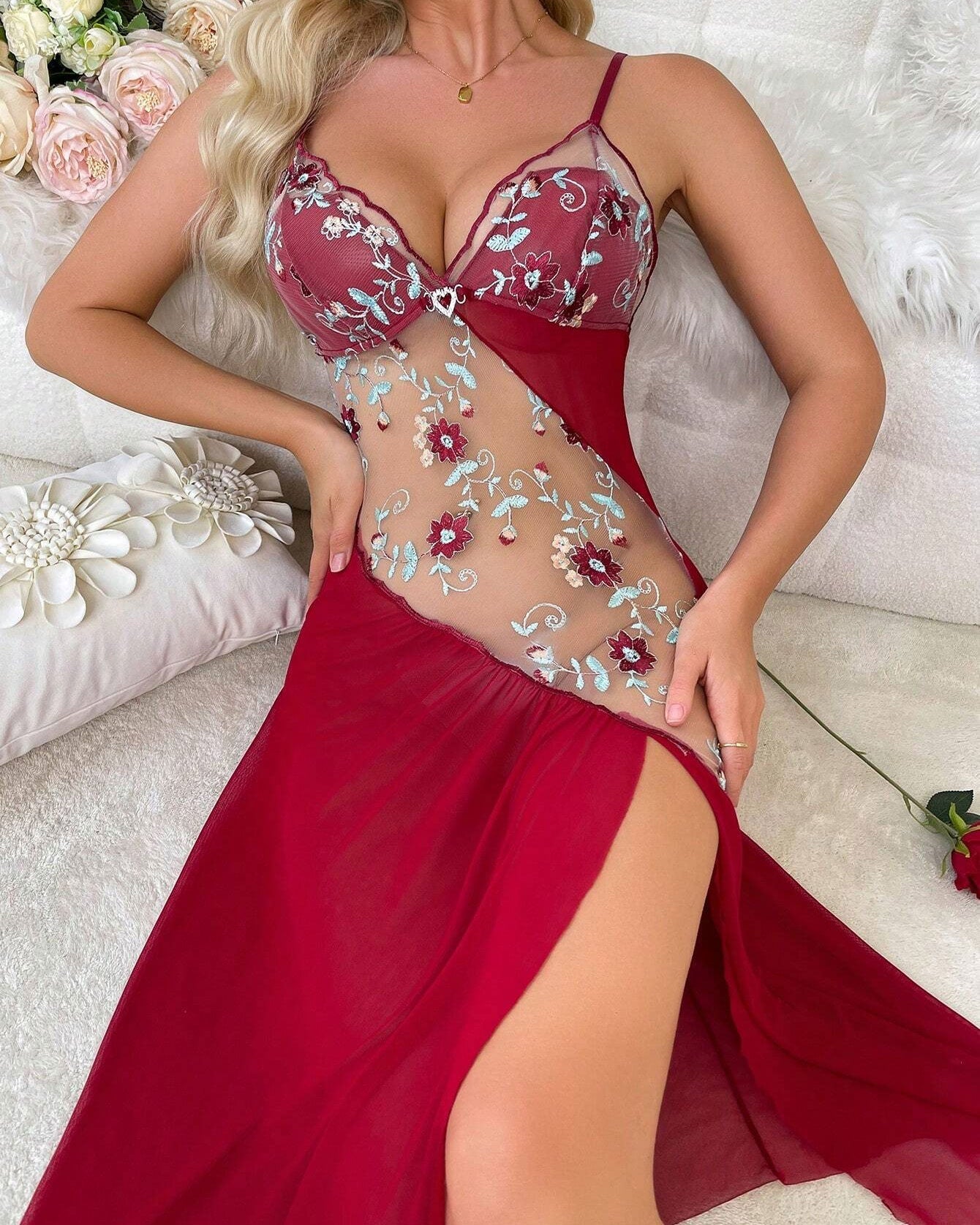 Sexy Sheer Mesh Nightgown – Floral Embroidery Babydoll