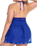 Design:This Mesh babydoll Sexy Backless Chemise Set featuring with sheer lace cups with a V-neck, halter tie straps, a sheer lace underbust band, a sheer mesh skirt with a satin trim, and a matching thong.